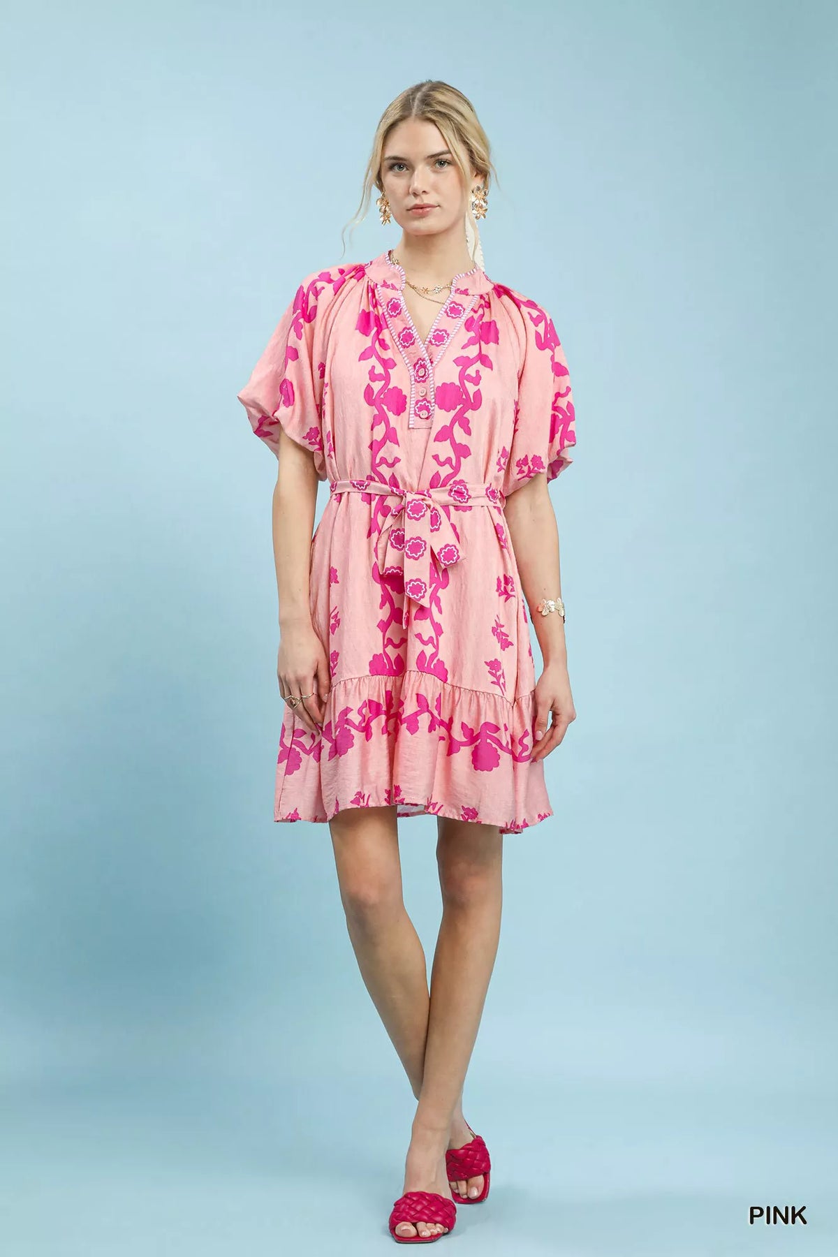 This floral tie-waist boho mini dress features a split V-neck with button detail and short dolman sleeves for a breezy and stylish look. The self-tie belt cinches at the waist, creating a flattering silhouette. The tiered skirt and contrast piping add a touch of detail and texture to the dress. Convenient side pockets provide functionality and practicality. Fully lined for comfort and coverage, this dress is perfect for a casual yet chic ensemble.